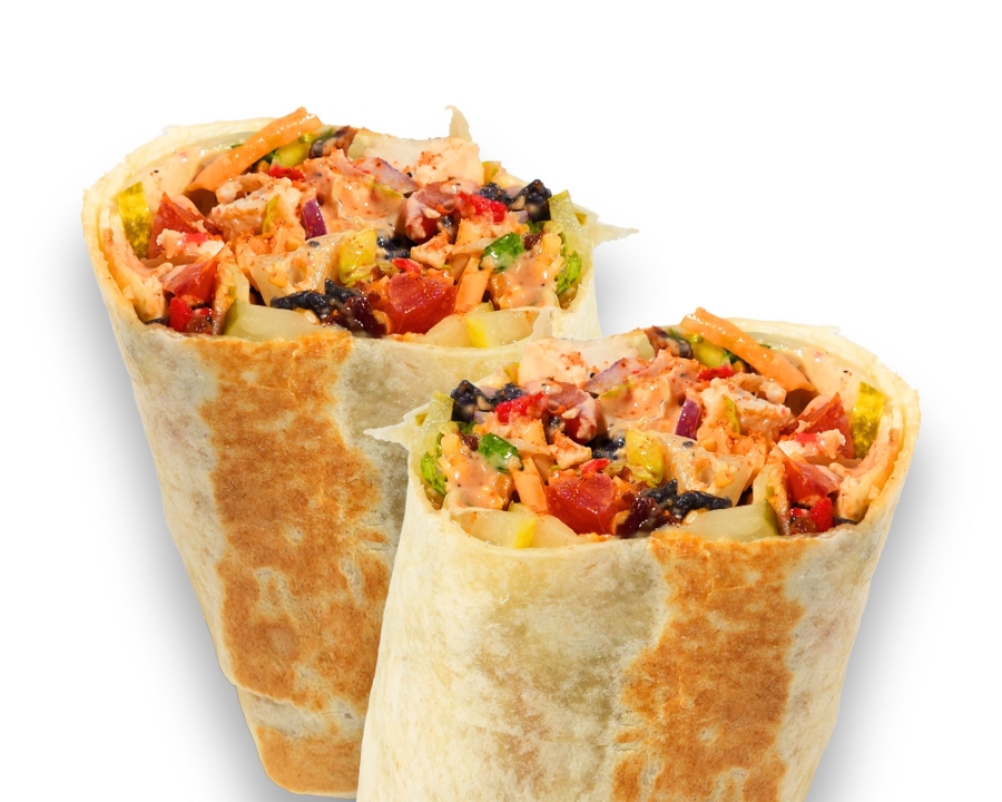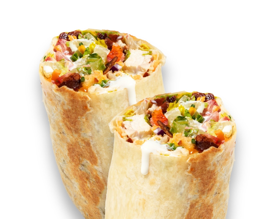 Oven-baked chicken, bacon, cheddar, red onion, tomatoes, romaine, croutons. Tossed in Ranch and Habanero Ranch Rub. Wrapped in a grilled flour tortilla. (Spice Level: Mild). 920 cal.