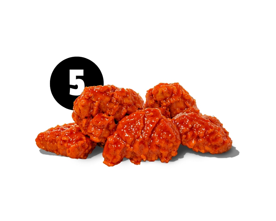 5 Boneless Wings with your choice of one sauce or rub. 670-1,030 cal.