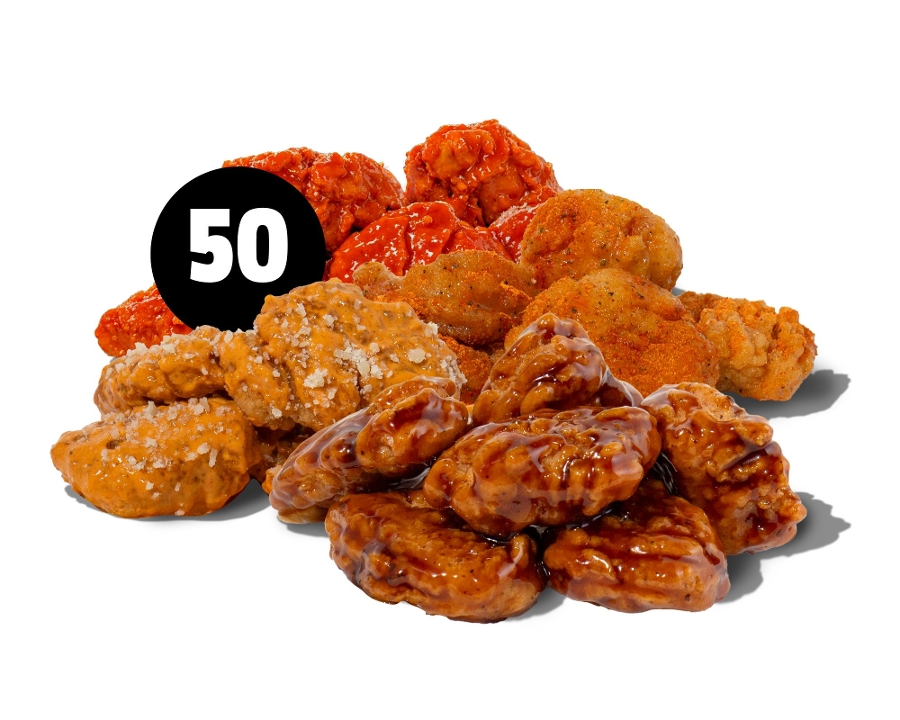 50 Boneless Wings with your choice of four sauces or rubs. 6,720-10,280 cal.