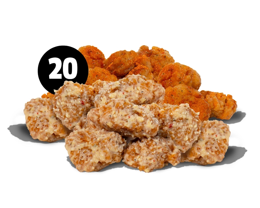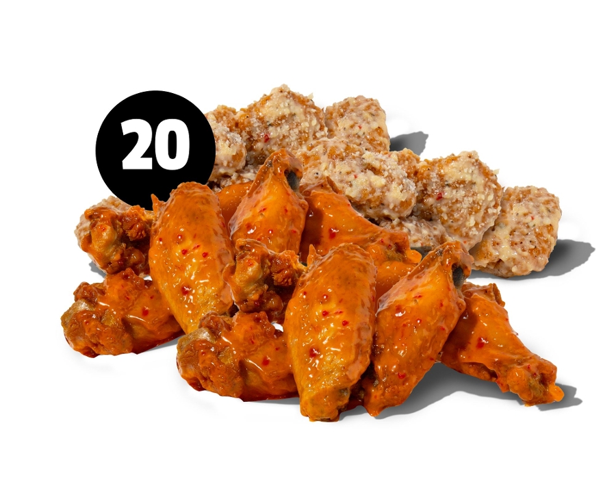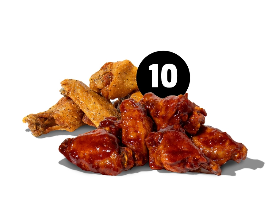 10 Classic and 10 Boneless wings with your choice of four sauces or rubs. 2,220-3,740 cal.