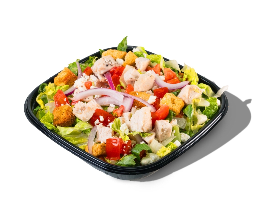 Oven-baked chicken, romaine, feta cheese, red onion, tomatoes, croutons, Greek seasonings, served with Greek vinaigrette. 550 cal.