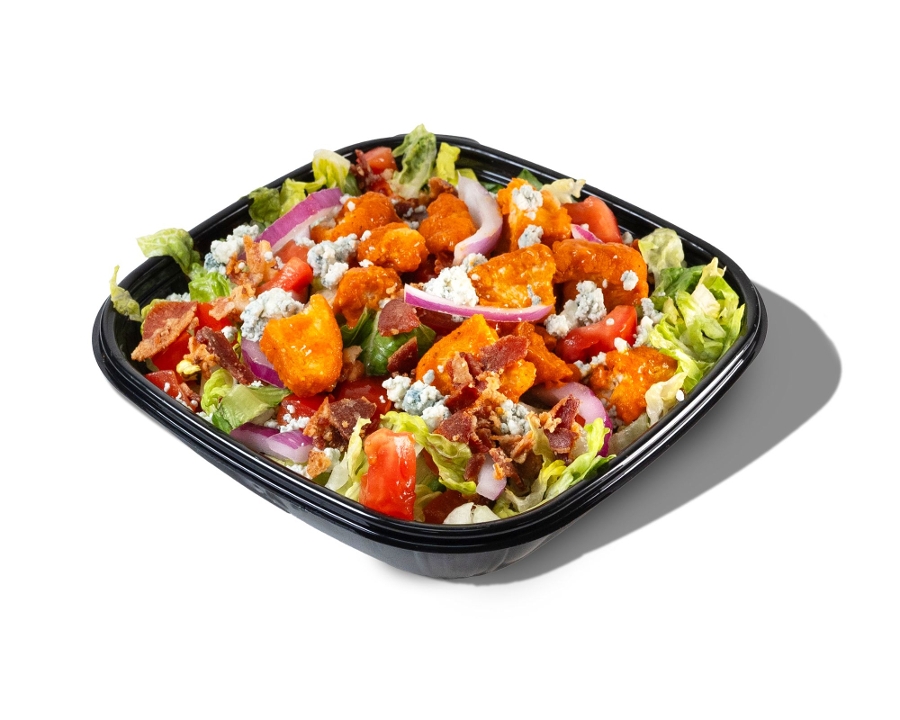 Crispy Buffalo chicken, romaine, tomatoes, red onion, bacon, bleu cheese crumbles, served with bleu cheese dressing. 940 cal.