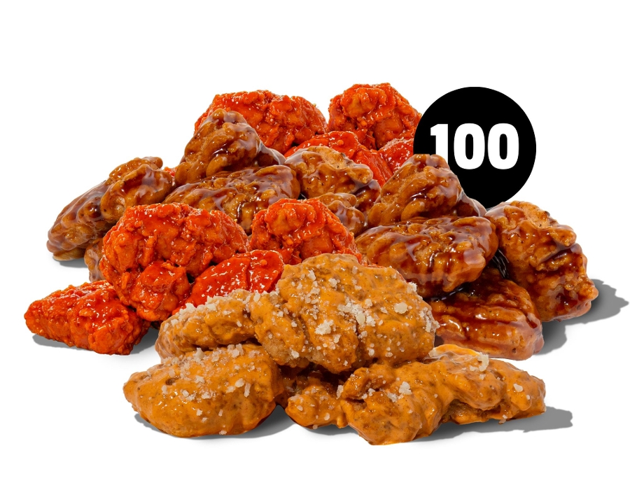 100 Boneless Wings with your choice of six sauces or rubs 13,440-20,570 cal.
