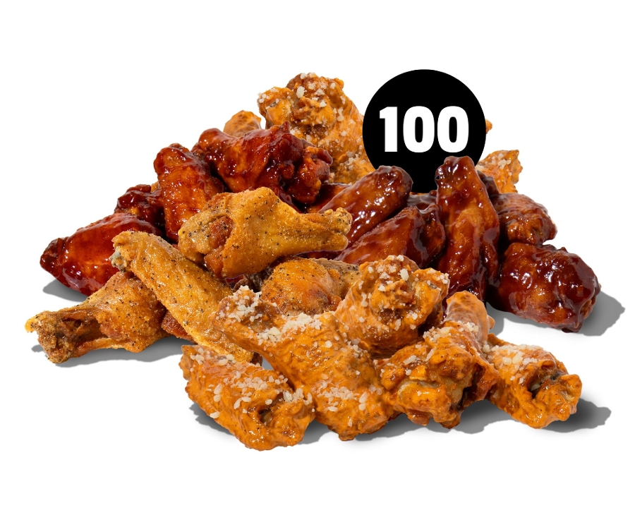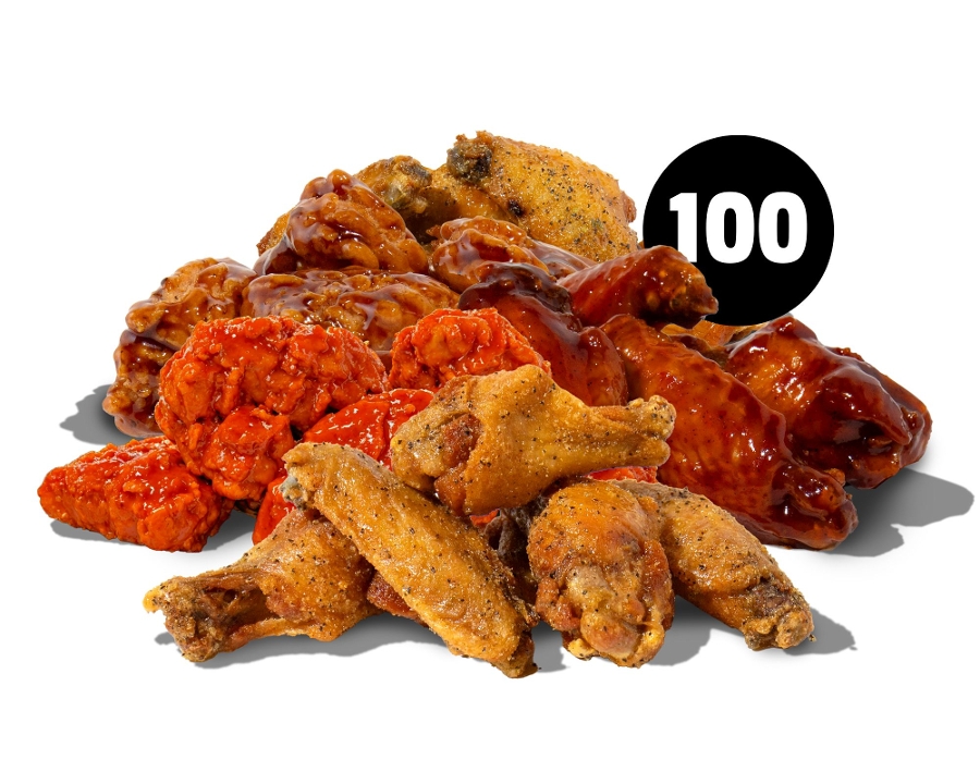 100 Classic Wings with your choice of six sauces or rubs. 8,730-16,860 cal.