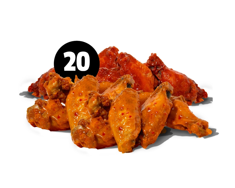 20 Classic Wings with your choice of four sauces or rubs. 1,750-3,370 cal.