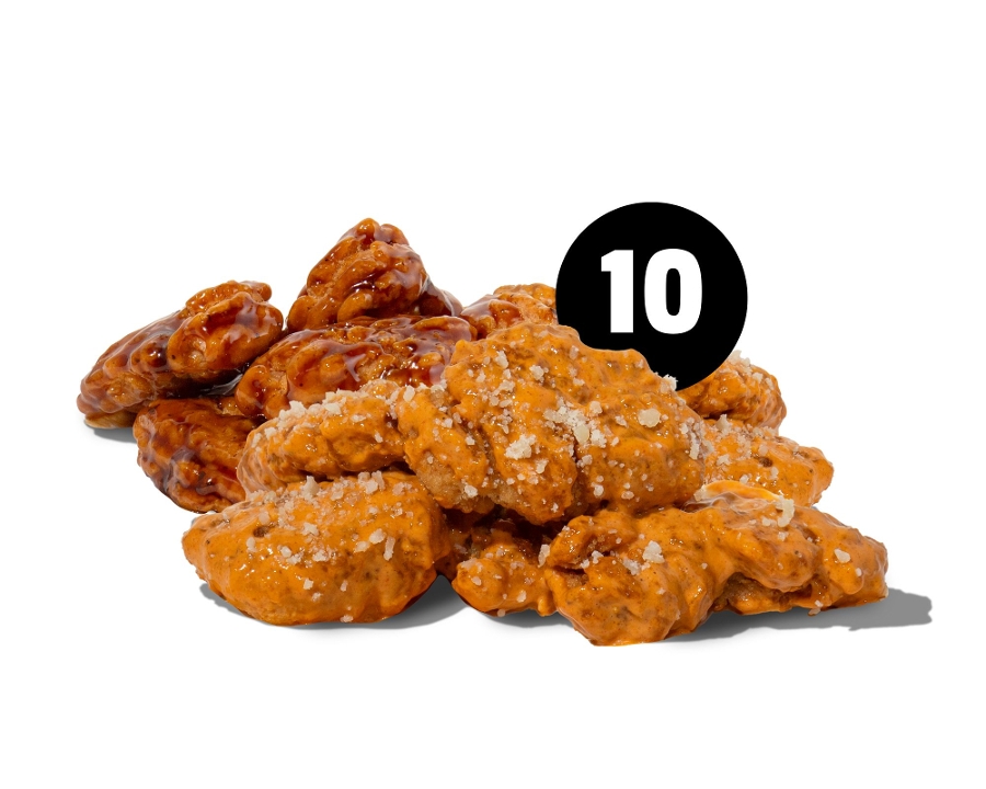 10 Boneless Wings with your choice of two sauces or rubs. 1,340-2,060 cal.