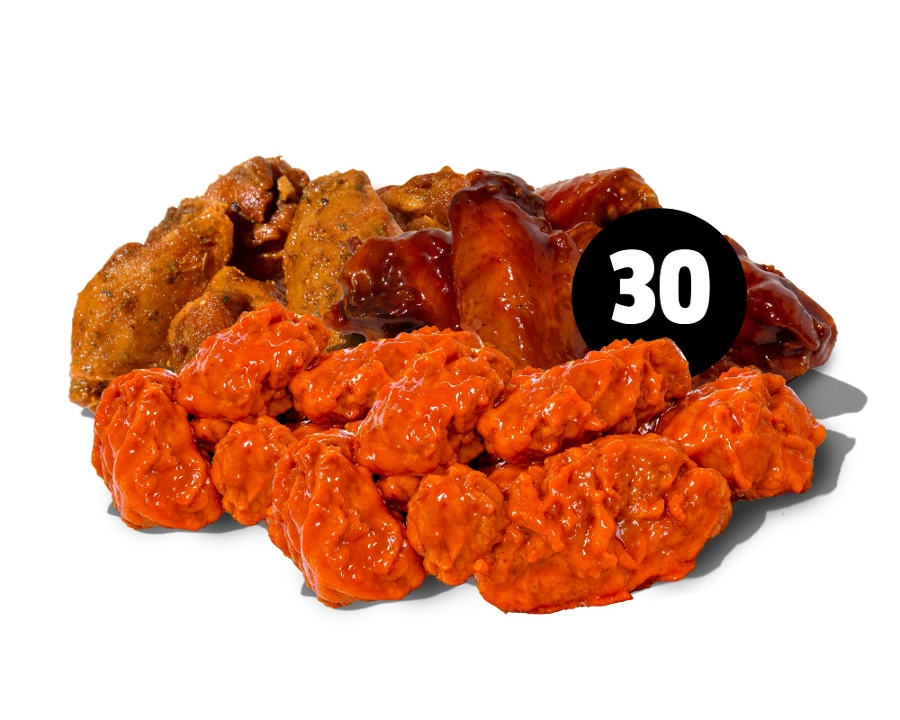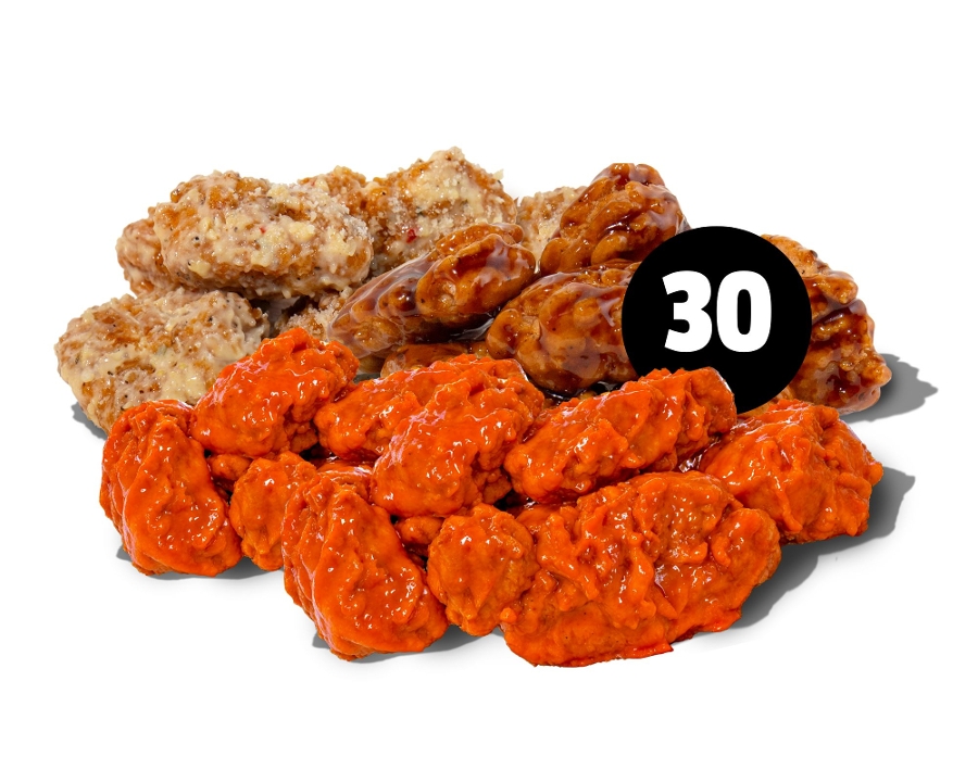 30 Boneless Wings with your choice of four sauces or rubs. 4,030-6,170 cal.