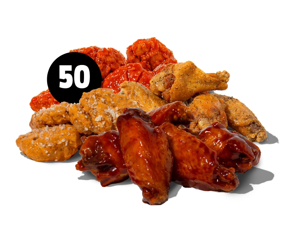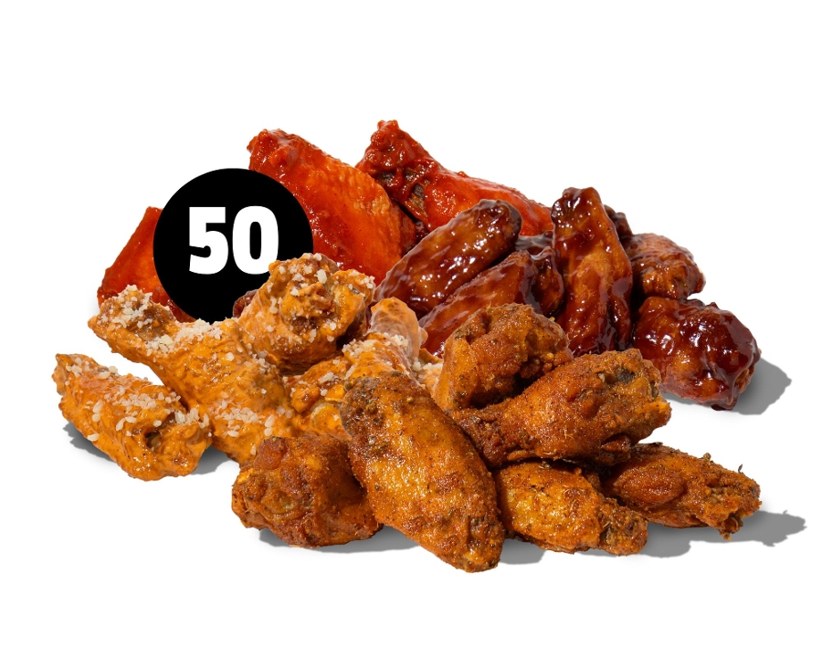 50 Classic Wings with your choice of four sauces or rubs. 4,370-8,430 cal.