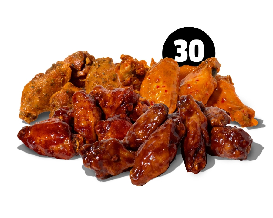 30 Classic Wings with your choice of four sauces or rubs. 2,620-5,060 cal.