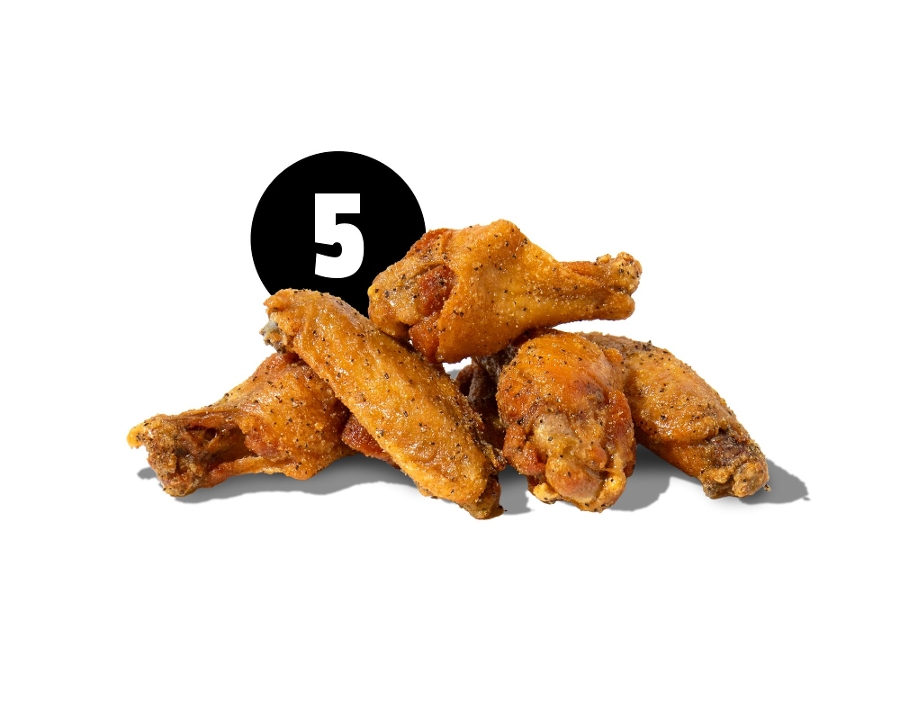 5 Classic Wings with your choice of one sauce or rub. 440-840 cal.