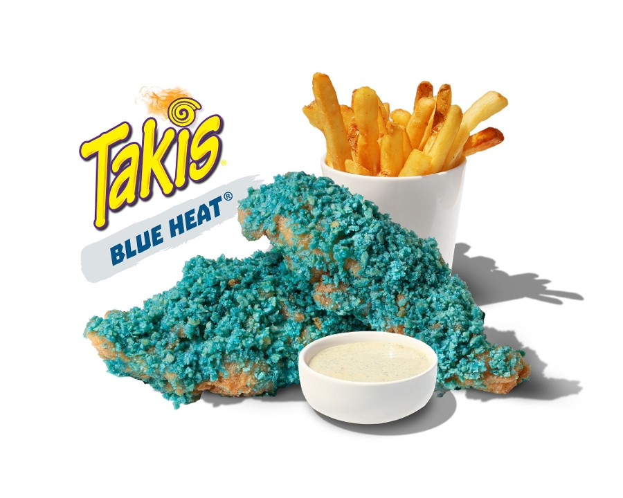 Two hand battered tenders rolled in crushed Blue Heat Takis and served with a side of ranch and a side of fries.