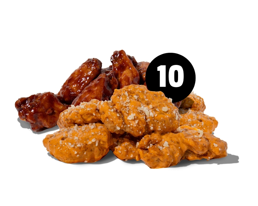 5 Classic and 5 Boneless wings with your choice of two sauces or rubs. 1,110-1,870 cal.