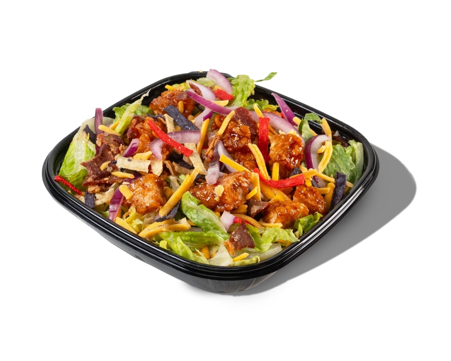 Oven-baked chicken, romaine, cheddar, coleslaw, red onion, tomatoes, tortilla strips. Tossed in Honey BBQ. (Spice Level: Mild). 830 cal.